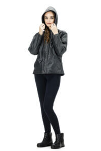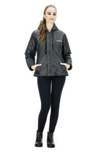 Jaqueta com capuz, forrada com matelassê de 80g, bolsos externos e fechamento frontal com zíper e botão de pressão metálico.